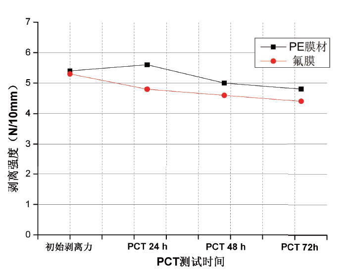 復合常規氟膜、PE膜后的性能:(上膠量:6-10g/㎡,固化條件:50℃ 2天)